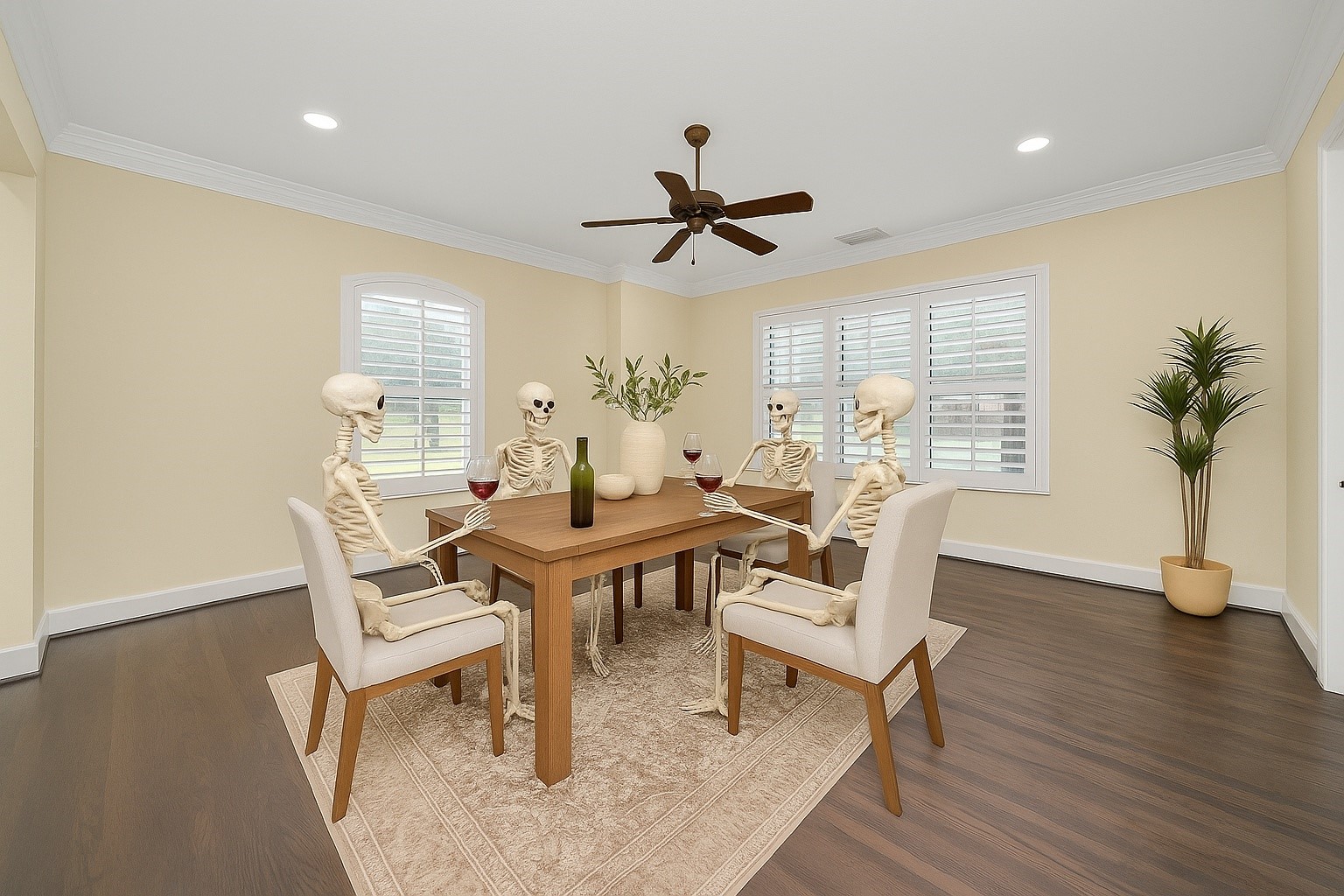 Are you here for the spookiest deal in all of Bellaire? Well, enter into 5212 Patrick Henry St only if you dare! Step through the double front doors into this 4 bedroom, 3.5 bath manor where you will suddenly feel a chill in the air, the silence deepening, and the creak of real hardwood floors. By day the house seems unassuming thanks to its recently resealed and repainted exterior, but by night, the custom Jellyfish lighting will guide you back like lanterns through the mist. The split tilt plantation blinds allow you the luxury of allowing just enough moonlight in to give you that truly unsettling feeling. Wander into the backyard for a midnight ritual on your lifeless, maintenance free turf. But to the discerning buyer, or daring wanderer, the true value lies in what is lingering in the shadows: two recently replaced water heaters, the EV ready garage with spider web like silky garage floors, and the silent garbage disposal that is quieter than the spiders crawl through the night.