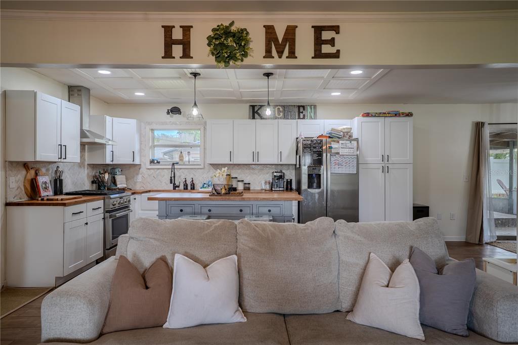 Under contract-accepting backup offers. Nestled on over a quarter acre, this stunning four-bedroom, three-bathroom residence combines modern elegance with cozy charm, making it the perfect oasis for families or those who love to entertain. Step inside to discover an inviting open concept floor plan that seamlessly connects the living, dining, and kitchen areas, all adorned with stylish tile flooring for easy maintenance. This home boasts so many stylish updates throughout, including chic shiplap accents, board and batten walls, and decorative ceilings that elevate its aesthetic appeal and create a truly unique ambiance. Your culinary dreams come true in the completely renovated kitchen, featuring butcher block countertops, a beautiful farmhouse sink, and a spacious kitchen island. The stainless steel appliances, including a gas range, are complemented by a decorative Chevron pattern tile backsplash that adds a touch of flair to this culinary haven. Retreat to the large primary bedroom, a serene sanctuary boasting an en suite bath that offers both comfort and privacy. Laminate flooring adds warmth, making it a cozy retreat after a long day. The additional two bedrooms provide ample space for family or guests, ensuring everyone has their own haven. Adding to the versatility of this delightful home is a spacious 15 x 12 room with a separate entrance, perfect for a mother-in-law suite, home office, or guest accommodation. It provides privacy and independence while still being close to the main living areas. The dining area, adorned with elegant crown molding, is perfect for family gatherings and dinner parties. Sliding doors lead you to a large screened-in porch, where morning coffee or evening relaxation becomes an everyday delight. From the porch, step out onto a spacious patio featuring a raised brick fire pit area, ideal for toasting marshmallows and creating lasting memories with loved ones. Located directly across the street from a large playground and tennis courts, complete with swings, a merry-go-round, and more, this home is perfect for families seeking outdoor fun and recreation. Your fenced backyard offers a grassy expanse perfect for children to play or for your furry friends to roam freely. Majestic grandfather oaks grace the property, with towering trees providing ample shade and enhancing the overall charm and curb appeal of this beautiful home. This home is not just a place to live; its a lifestyle waiting to be embraced. Dont miss the chance to make this beautiful property your own! Schedule your showing today and step into a world where comfort meets style.