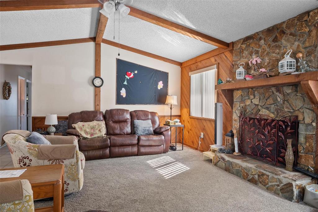 Welcome to your dream home in the desirable Indian Trails community, where comfort meets style on a spacious 0.34-acre lot. This charming three-bedroom, two-bathroom residence features a two-car garage and a warm foyer that leads to a generous living room adorned with hugh ceilings, cedar beams, and a cozy wood-burning fireplace. The inviting cedar finishes enhance the living and dining areas, with plush carpeting in the living room and sleek tile flooring in the kitchen, dining, and hallways. The expansive primary bedroom boasts a massive walk-in closet and an en suite bath, with sliding doors that open to a stunning screened-in pool area. The kitchen is a delight, equipped with a brand-new refrigerator and microwave, along with stainless steel appliances that overlook the impressive 15 x 32-foot pool, featuring a liner that is only six years old. Enjoy the shade provided by a magnificent oak tree in the backyard, complemented by two handy storage sheds. With fully paid-off solar panels and a location just a short walk from Publix Shopping Center and other local amenities, this home is also conveniently close to George Jenkins High School. Dont miss the opportunity to make this remarkable property your own!