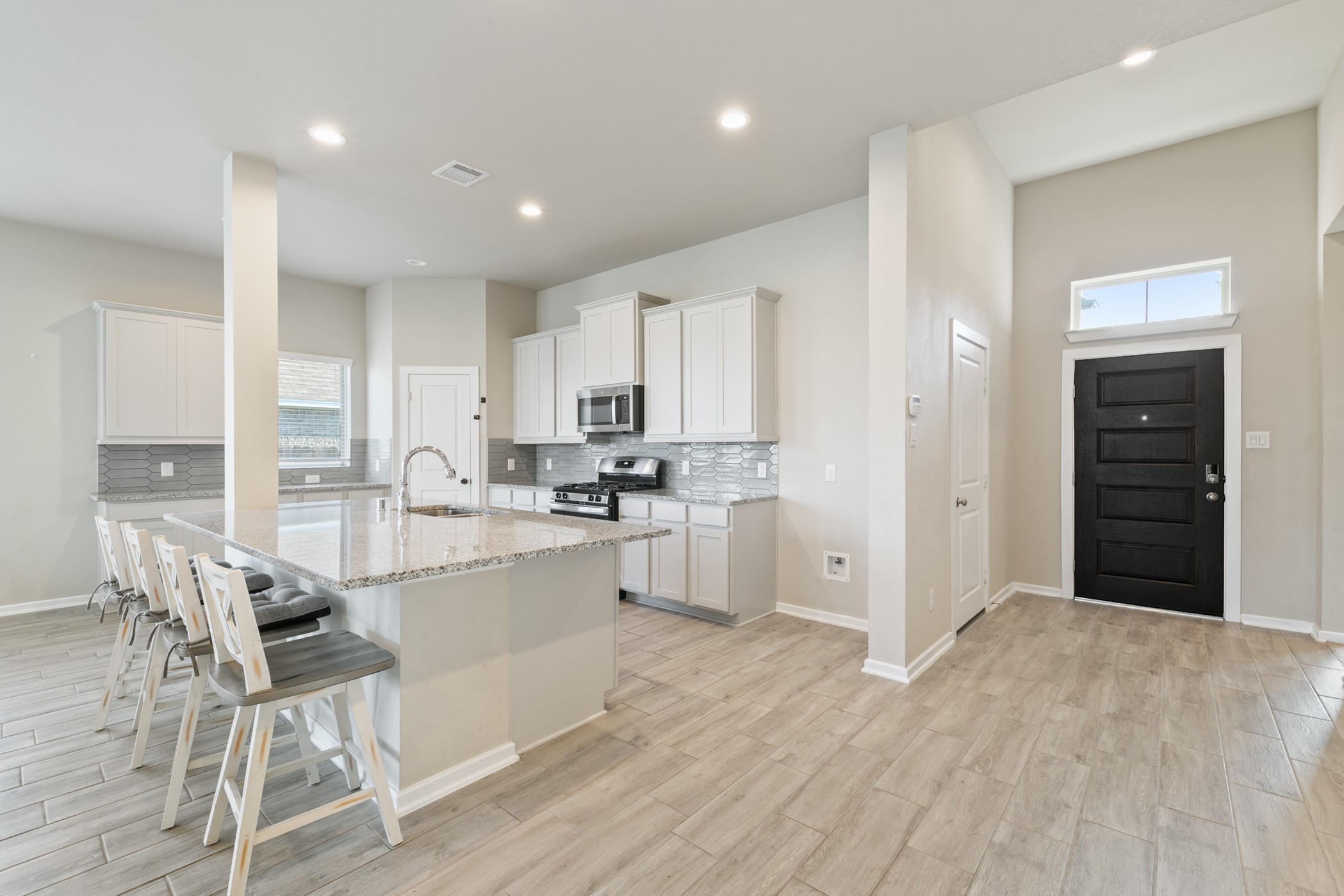 Step into this beautiful 4-bed single-story home, thoughtfully designed w/ an open floor plan perfect for everyday living and entertaining. Rich wood-look tile flows throughout the main living areas, complemented by high ceilings that add to the homes airy & inviting feel. The gorgeous kitchen is a true centerpiece, featuring crisp white cabinets, a large island w/ a built-in sink, gleaming granite countertops, & sleek recessed lighting. Whether youre preparing a quick meal or hosting a dinner party, this space is as functional as it is stylish. All bedrooms are conveniently located for privacy & comfort, w/ the versatile 4th bedroom easily doubling as a home office or guest room. The layout offers flexibility to suit your lifestyle. Outside, youll find a spacious fenced backyard w/ a covered patio, the perfect setting for weekend barbecues, gatherings, or simply unwinding at the end of the day. Blending style, comfort, & versatility, this home is ready to welcome its next owner.