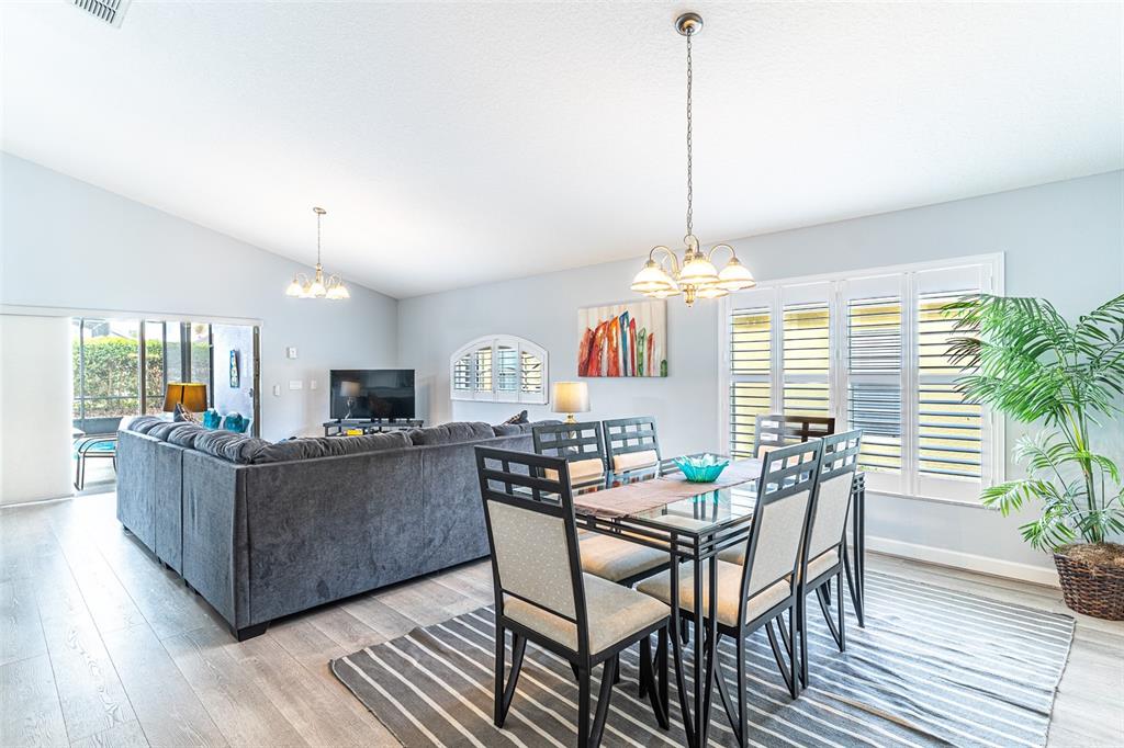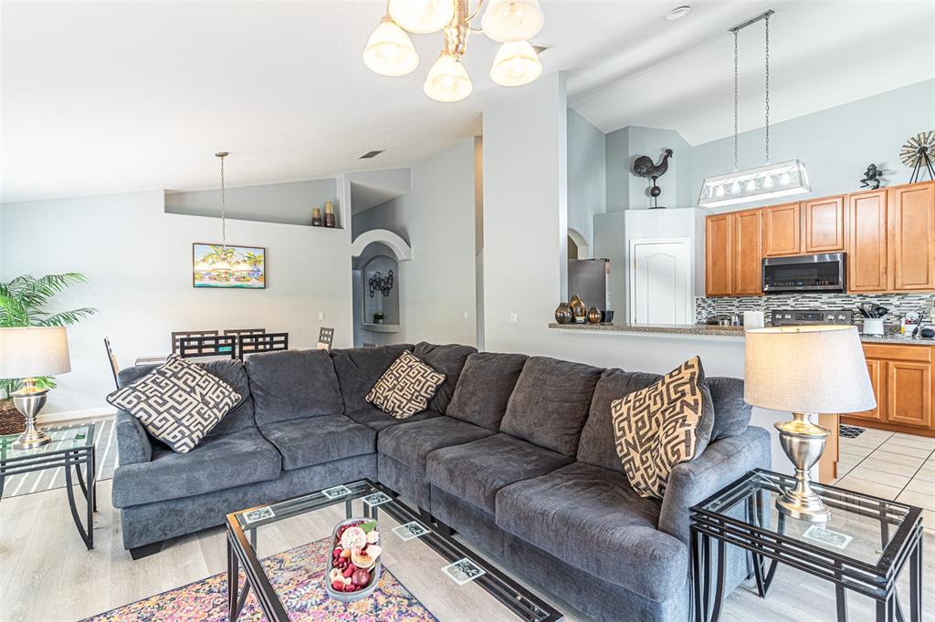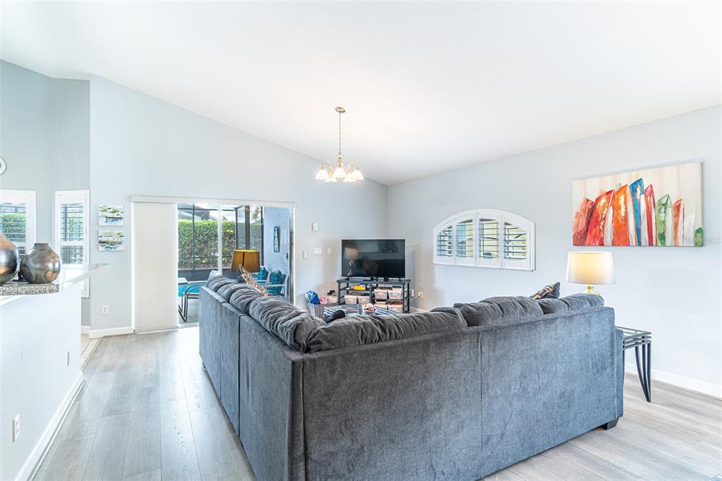 Nestled in the highly sought-after West Stonebridge neighborhood, this meticulously maintained three-bedroom, three-bath home offers a perfect blend of comfort and elegance. Featuring an open concept floor plan with soaring ceilings, the living area seamlessly connects to a beautifully landscaped outdoor oasis complete with a completely enclosed screened-in pool and spa, ensuring year-round enjoyment. The stylish laminate flooring flows throughout, with tile accents in the kitchen and bathrooms. The heart of the home boasts a bright nook overlooking the pool, a breakfast bar, and a convenient closet pantry. The primary suite is a true retreat, featuring an en suite bath with a luxurious walk-in closet, a spacious shower with dual showerheads, and private access to the pool area through sliding doors. A large utility room off the garage adds to the homes functionality, complete with shelving for storage and included washer and dryer. With significant updates including a new roof installed in 2024, an efficient AC system from 2021, a five-year-old water heater and new dishwasher, peace of mind is guaranteed. Additional highlights include plantation shutters, a larger-than-average lanai, and a third bathroom conveniently located poolside. With privacy hedges maintained by the HOA and a south-facing pool that maximizes your daily sunlight, this home is a tranquil haven. Conveniently located near Interstate 4, shopping, entertainment, and theme parks, this property is a perfect blend of luxury and location.