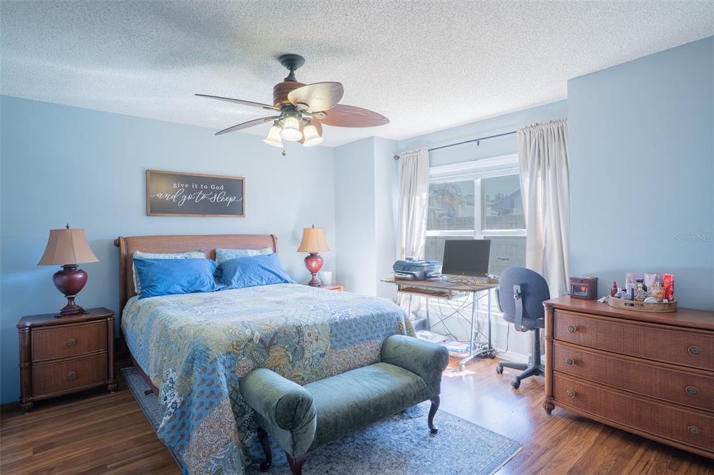 Presenting a three-bedroom, two-bath single-family home that effortlessly blends comfort and charm in a well-maintained setting. This single-story property boasts stucco exterior walls accented with elegant stone veneer, combining strength with timeless curb appeal. Nestled on an oversized corner lot, the home features a fenced backyard adorned with mature trees and a screened back porch, ideal for unwinding or entertaining beneath the open sky.Step inside, and youll discover a functional open layout that seamlessly connects the living, dining, and kitchen areas. Large windows in the living room flood the space with natural light, creating an inviting atmosphere that enhances the beauty of the laminate wood flooring. The kitchen, designed with practicality in mind, is equipped with white cabinetry, laminate countertops, a stylish tile backsplash, and sleek stainless steel appliances. A set of French doors in the dining area opens to the screened porch, allowing for an effortless indoor-outdoor flow while maintaining the abundance of natural light.The primary bedroom is a serene retreat, featuring laminate flooring, a ceiling fan for comfort, a spacious walk-in closet, and an ensuite bathroom adorned with dual sinks, a solid-surface vanity, and a tub-shower combination. The secondary bedrooms, also boasting laminate flooring and neutral tones, provide a cohesive, move-in-ready feel throughout the home.Additional highlights include energy-efficient double-pane windows with blinds, owned security system with two cameras, ceiling fans strategically placed for optimal airflow, and an oversized two-car garage with a paved driveway for added convenience. With its thoughtful layout, low-maintenance exterior, and inviting outdoor spaces, this property offers a perfect blend of comfort and practicality, making it an ideal place to call home.