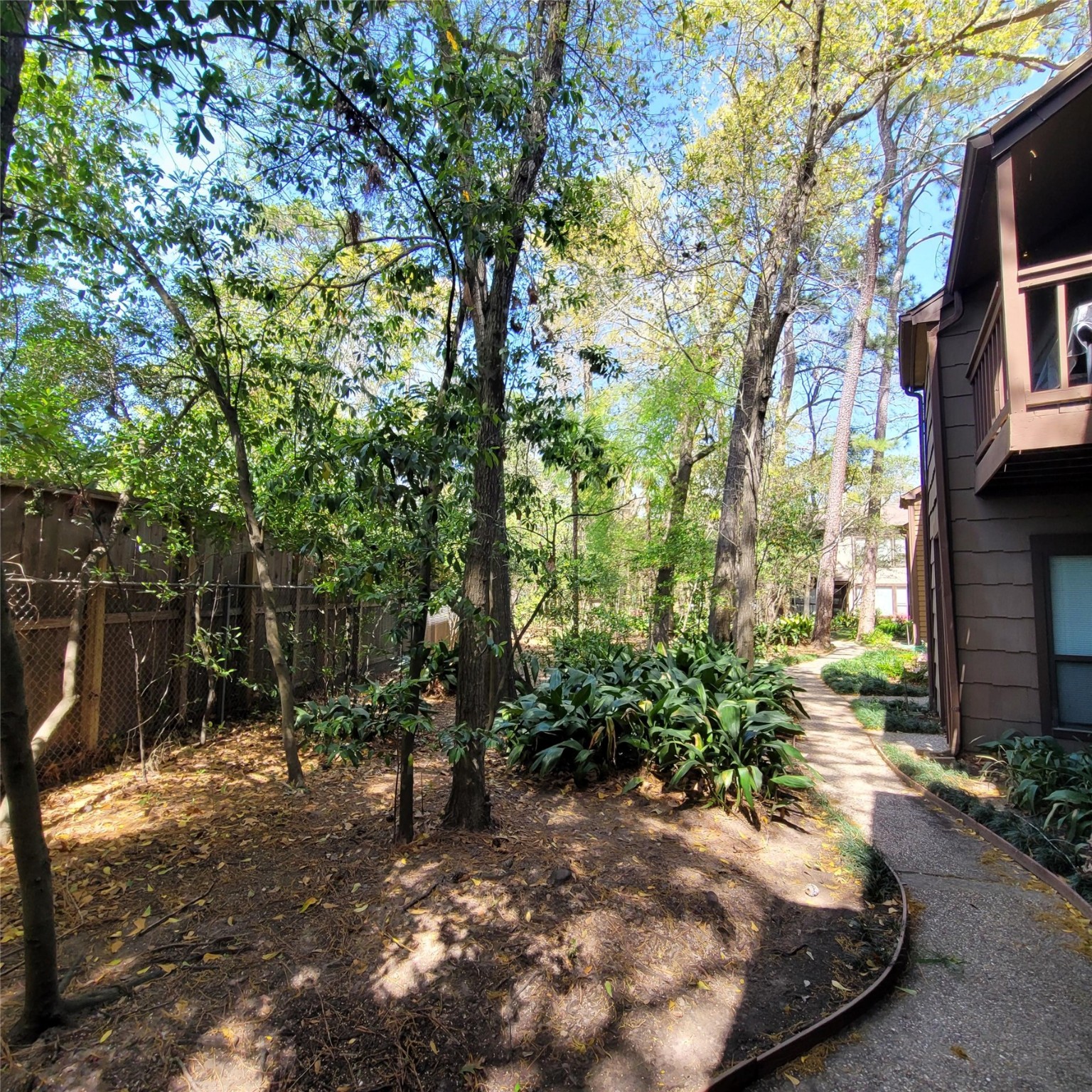 Secluded condo in lovely Hudson Oaks; this unit is on the far west side of the complex, heavily wooded area, next to Sandalwood. Peaceful & quiet, yet just a few steps to the beautiful pool and greenbelt. Living, dining & kitchen are down. Spacious primary suite w/cathedral ceiling is up along w/an extra bonus room that can be used as a study, reading nook, exercise, etc. This "C" plan is a walk-through unit w/a front & back door leading to a decked patio with its own pine tree and 2 reserved parking spaces. Longtime owner had to move to senior living. Its been lovingly maintained; just needs a little TLC. AC new in 22, garbage disp in 24, Pl shutters in LR. Quite livable; you may want to add your personal touches! These walk-through "C" units are rare! HOA covers maintenance of pools & grounds, all exteriors, water, sewer, trash, Xfinity internet, and 24/7 manned entry. Come home to Hudson Oaks (a former boy scout camp grounds) in the heart of Memorial!