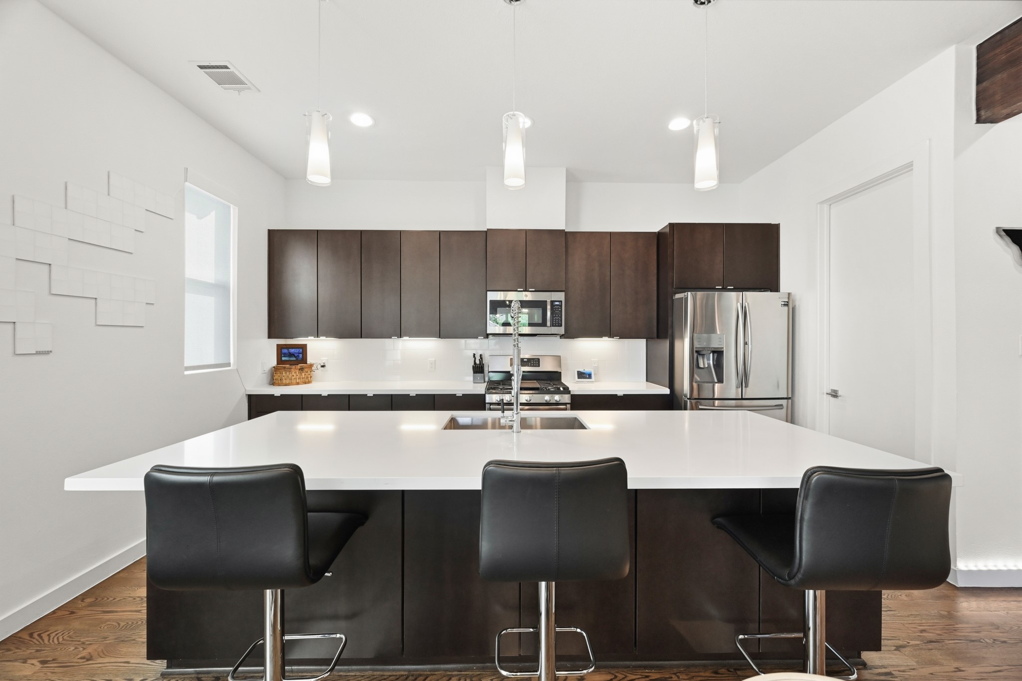 This unique property has high ceilings, large windows with lots of natural light and balconies on every floor. The second floor features an open living concept designed with exposed beam across the ceiling and metal staircase leading up to the third floor. The kitchen features a large island with quartz counters, designer flat front cabinets in espresso and extra storage in the island cabinets. Stainless-steel appliances by GE, double ovens, walk in pantry and undermount lighting. Solid hardwood floors throughout. Large Primary bedroom with custom built walk-in closet. Primary bathroom features a freestanding bathtub, separate frameless glass shower and double vanities. Laundry conveniently located on the third floor. Modern lighting and plumbing fixtures. Oversized Rooftop deck with sweeping views of downtown and The Heights, already plumbed for water and gas. EV charging station in the garage. Farmers Market, hike and bike trails, local eateries and coffee shops in walking distance!