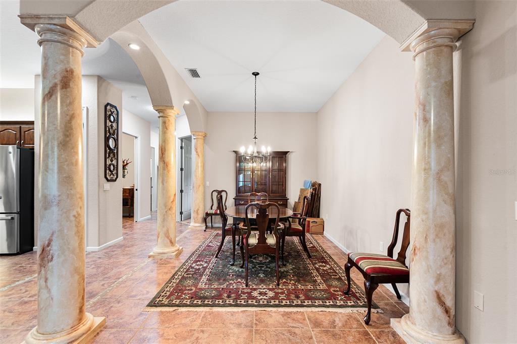 Move right into this beautiful 2 bedroom, 2 bath home with a den, offered fully furnished in a highly desired 55+ RV community. Designed for both comfort and convenience, this home features soaring 10-foot ceilings with 8-foot doors that add a spacious, elegant feel. The open floor plan is finished with tile throughout the main living space, plantation shutters, and double-pane windows that fill the home with natural light. The kitchen is a true highlight with granite countertops, stainless steel appliances, and plenty of storage. The den with built-ins and pocket doors makes the perfect office, hobby room, or flex space. Retreat to the primary suite, showcasing trey ceilings, a walk-in closet, and a huge shower with dual shower heads for a spa-like experience. Practical upgrades include a 2024 roof, new insulation, and a well for irrigation. An attached workshop under AC gives you the ideal space for projects year-round. Step outside to your huge screened lanai, perfect for morning coffee or entertaining friends in true Florida style. This property blends modern updates, thoughtful design, and the lifestyle youve been waiting forall in a welcoming RV community setting. Dont miss this one!