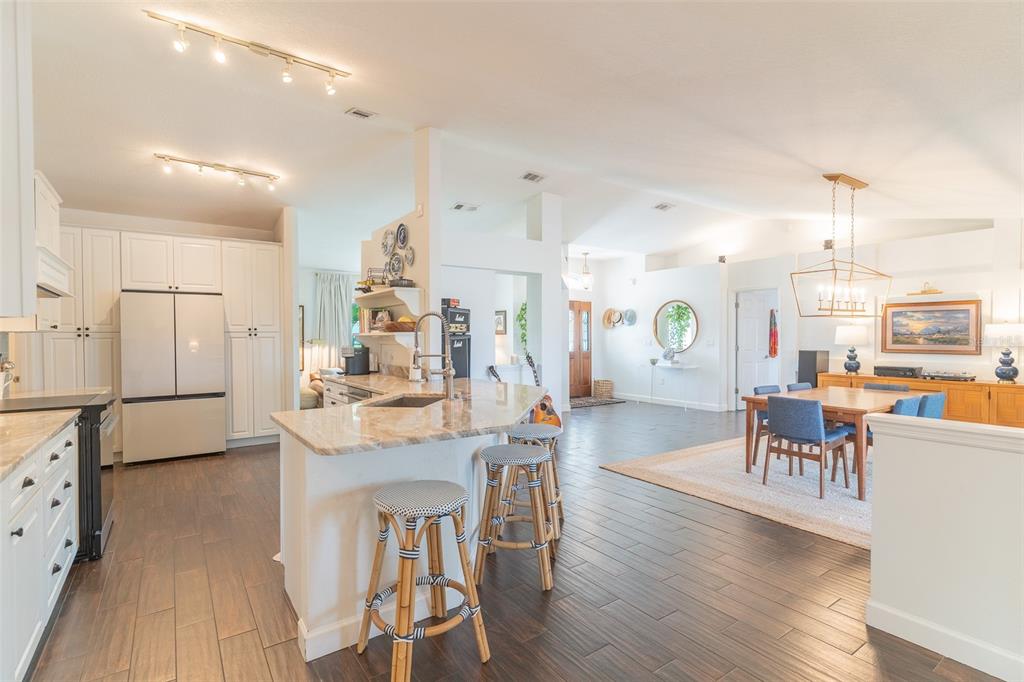 Completely renovated home with new pool on Cannon Lake! Welcome to your dream lakeside retreat on a sprawling lot with 120 feet of pristine lakefront on Lake Cannon. This completely renovated three-bedroom, two-bathroom home boasts an open floor plan with high ceilings and a desirable split-bedroom layout. The stunning kitchen features granite countertops, a counter-height breakfast bar, and brand-new Samsung bespoke appliances, including an induction stove, perfect for culinary enthusiasts. The expansive primary suite offers a luxurious en suite bath with a large shower equipped with multiple showerheads, including a rain showerhead, and sliding glass doors that lead to an impressive outdoor entertaining space. The screened-in patio, perfect for hosting gatherings, overlooks the brand-new saltwater, heated pool and spa, completed in 2025, creating an idyllic setting for relaxation and fun. Additionally, the home features a new roof and new windows, ensuring peace of mind for years to come. Enjoy unobstructed views of the lake from your large outdoor area, ideal for summer barbecues or evening stargazing. Conveniently located near shopping, restaurants, and entertainment, this home truly offers the best of lakeside living on the chain of lakes.