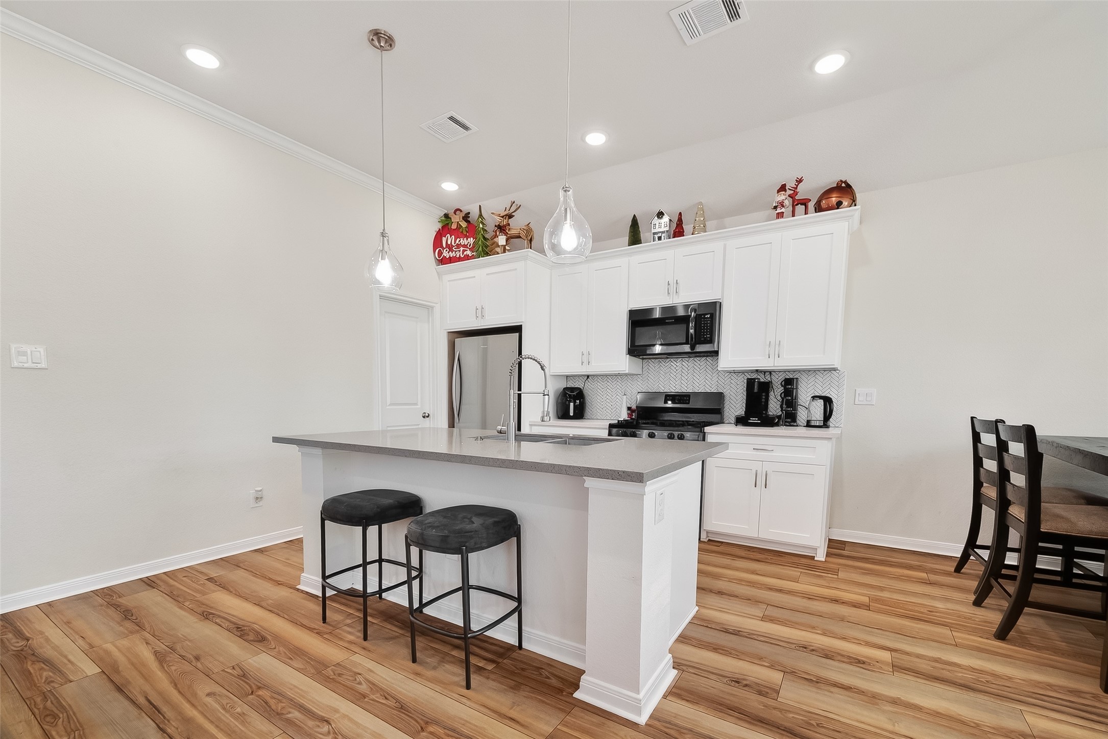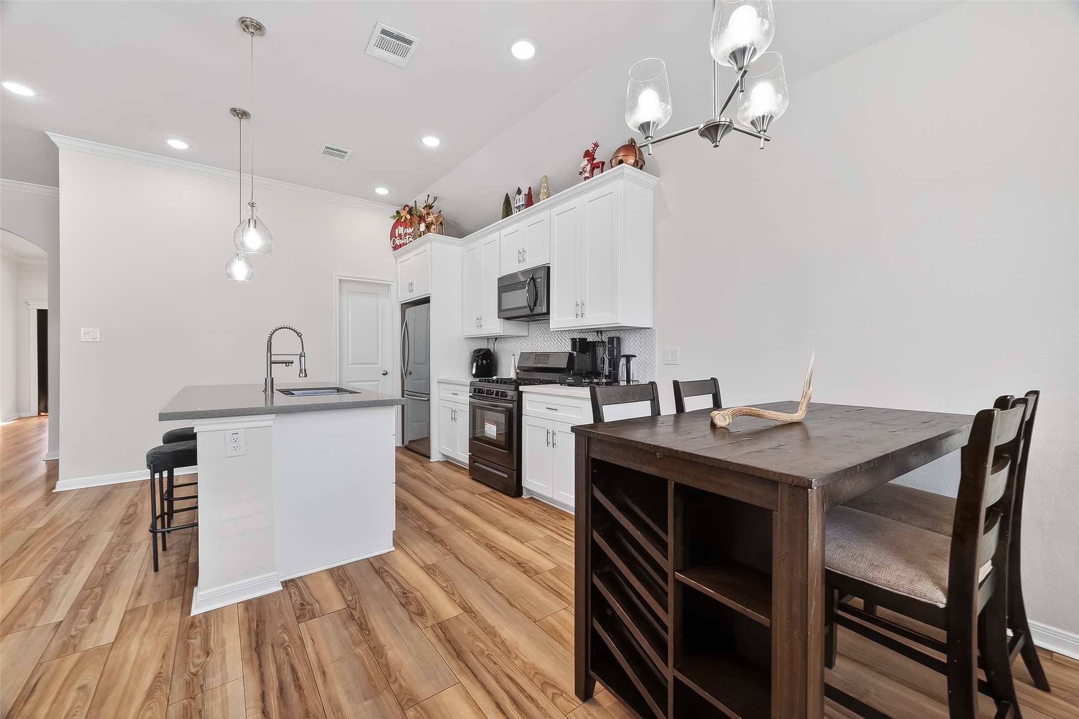 Hablamos espaol! Step inside this beautifully designed home featuring 3 spacious bedrooms and 2 full baths with a layout that perfectly blends comfort and functionality. The open concept kitchen flows seamlessly into the living and dining areas, creating an inviting space ideal for everyday living and effortless entertaining. A large utility room conveniently located just off the kitchen offers added storage and workspace, while the generous walk-in pantry keeps everything organized. The private primary suite is a relaxing retreat, complete with a soaking tub, separate shower, dual vanities, and an oversized walk-in closet. Bedrooms two and three are well-sized and share a full bathroom, making them ideal for family or guests. Durable laminate flooring runs throughout the home, complemented by tile in all wet areas for easy maintenance. Outside, enjoy a covered patio and a fully fenced backyard perfect for relaxing, entertaining, or pets. This home is a must-see!