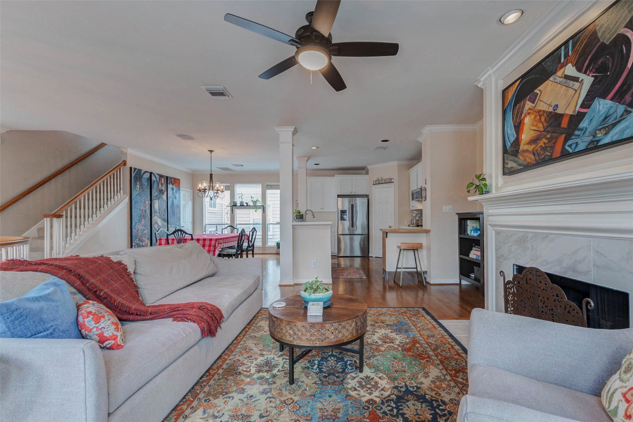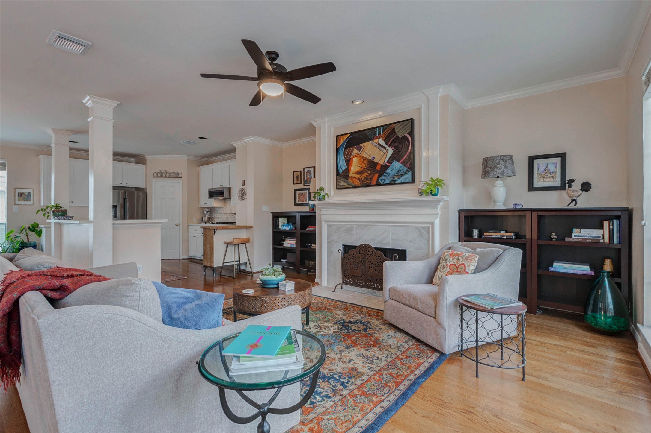 Exceptional Perry built townhome in the heart of Montrose, offering QUIET refined city living in one of Houstons most vibrant neighborhoods/never flooded (seller). Ideally located just steps from the acclaimed dining, shopping, & nightlife.The rare, open second-floor living area is filled with natural light from a dramatic wall of windows, showcasing rich hardwood floors, soaring ceilings, and a gas fireplacean ideal space for both relaxing and entertaining. The chefs kitchen features beautiful Corian countertops, fresh appliances, a five-burner gas cooktop, breakfast bar, storage. The luxurious primary suite features treetop views, a spa-inspired bath with soaking tub, separate shower, double vanities, & oversized walk-in closet, completing this sophisticated Montrose retreat. Major recent improvements include roof replacement, HVAC system, foundation stabilization, plumbing main drain replacement, and numerous additional updatesproviding peace of mind for years to come.